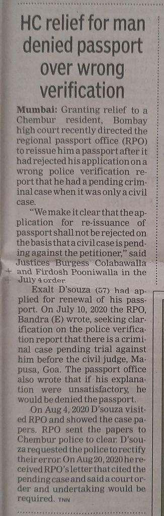 Exalt D’souza (57) had applied for renewal of his passport. On July 10, 2020 the RPO, Bandra (E) wrote, seeking clarification on the police verifica- tion report that there is a criminal case pending trial against him before the civil judge, Mapusa, Goa. The passport office also wrote that if his explanation were unsatisfactory, he would be denied the passport.