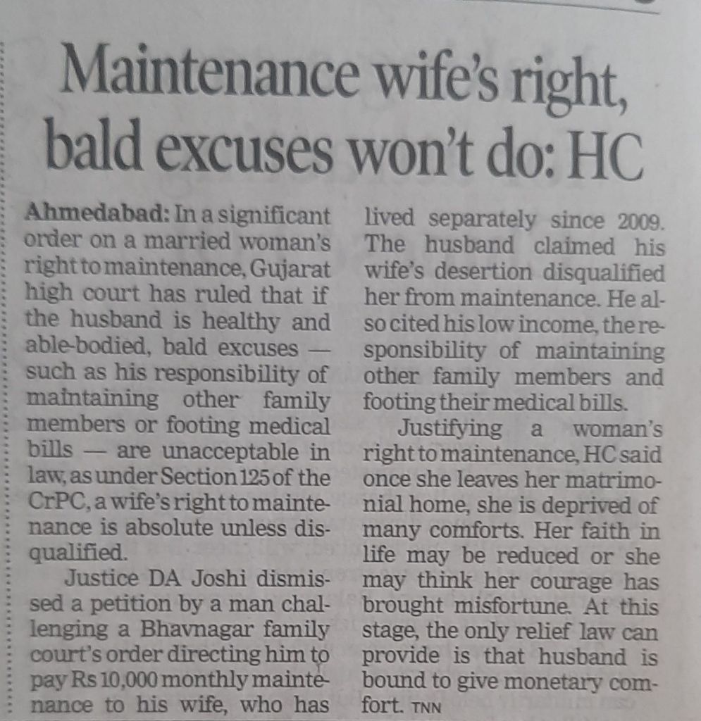 Ahmedabad: In a significant order on a married woman’s right to maintenance, Gujarat high court has ruled that if the husband is healthy and able-bodied, bald excuses such as his responsibility of maintaining other family members or footing medical bills are unacceptable in law, as under Section 125 of the CrPC, a wife’s right to maintenance is absolute unless disqualified.