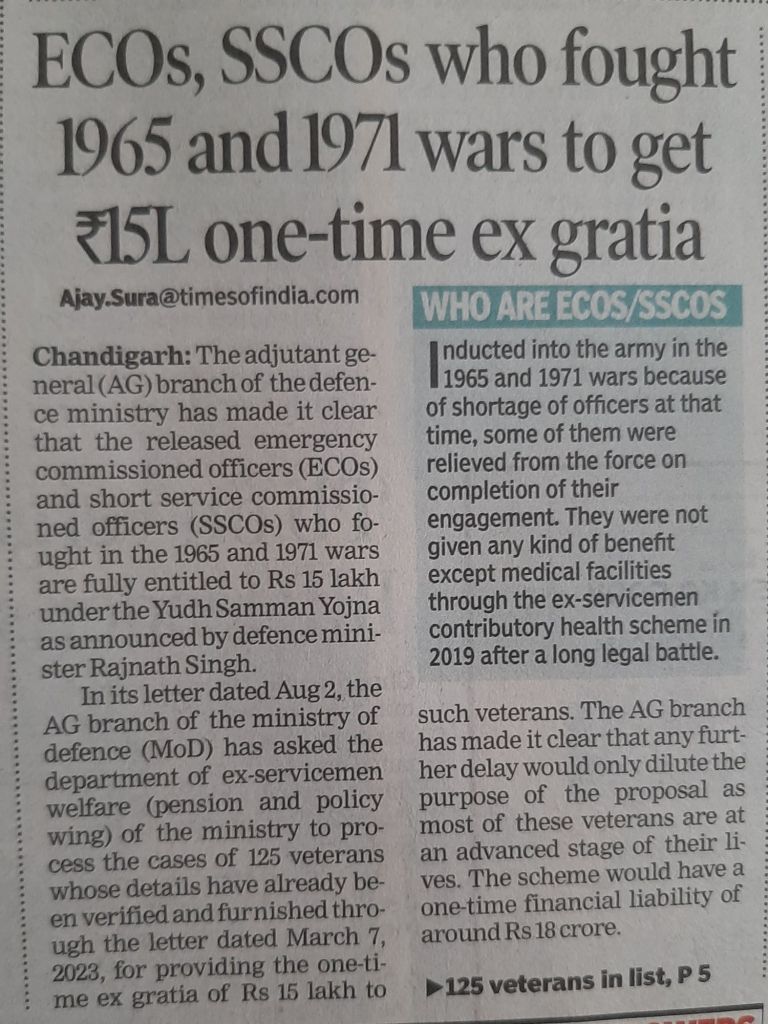Chandigarh: The adjutant general (AG) branch of the defence ministry has made it clear that the released emergency commissioned officers (ECOS) and short service commissioned officers (SSCOs) who fought in the 1965 and 1971 wars are fully entitled to Rs 15 lakh under the Yudh Samman Yojna as announced by defence minister Rajnath Singh.