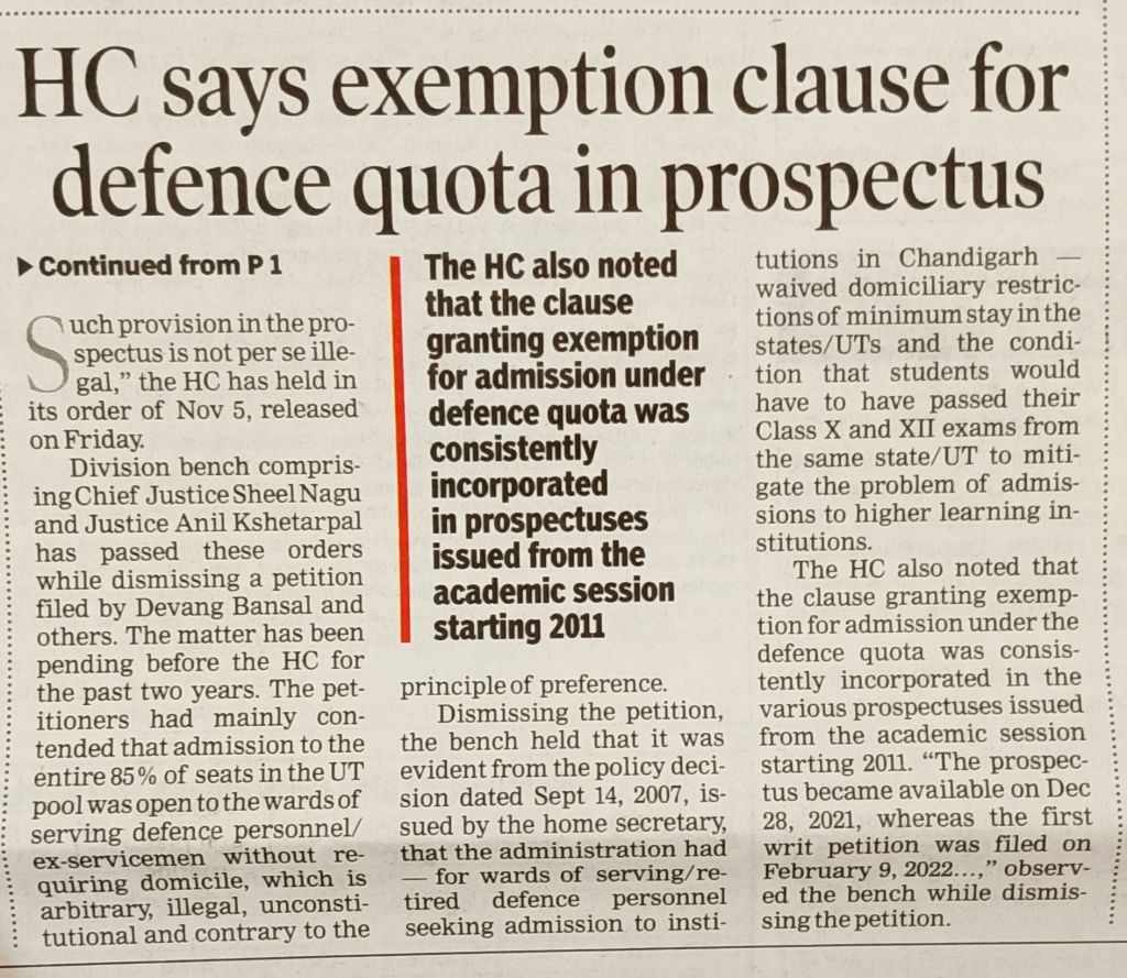 Division bench comprising Chief Justice Sheel Nagu and Justice Anil Kshetarpal has passed these orders while dismissing a petition filed by Devang Bansal and others. The matter has been pending before the HC for the past two years. The pet itioners had mainly contended that admission to the entire 85% of seats in the UT pool was open to the wards of serving defence personnel/ ex-servicemen without requiring domicile, which is arbitrary, illegal, unconstitutional and contrary to the principle of preference.