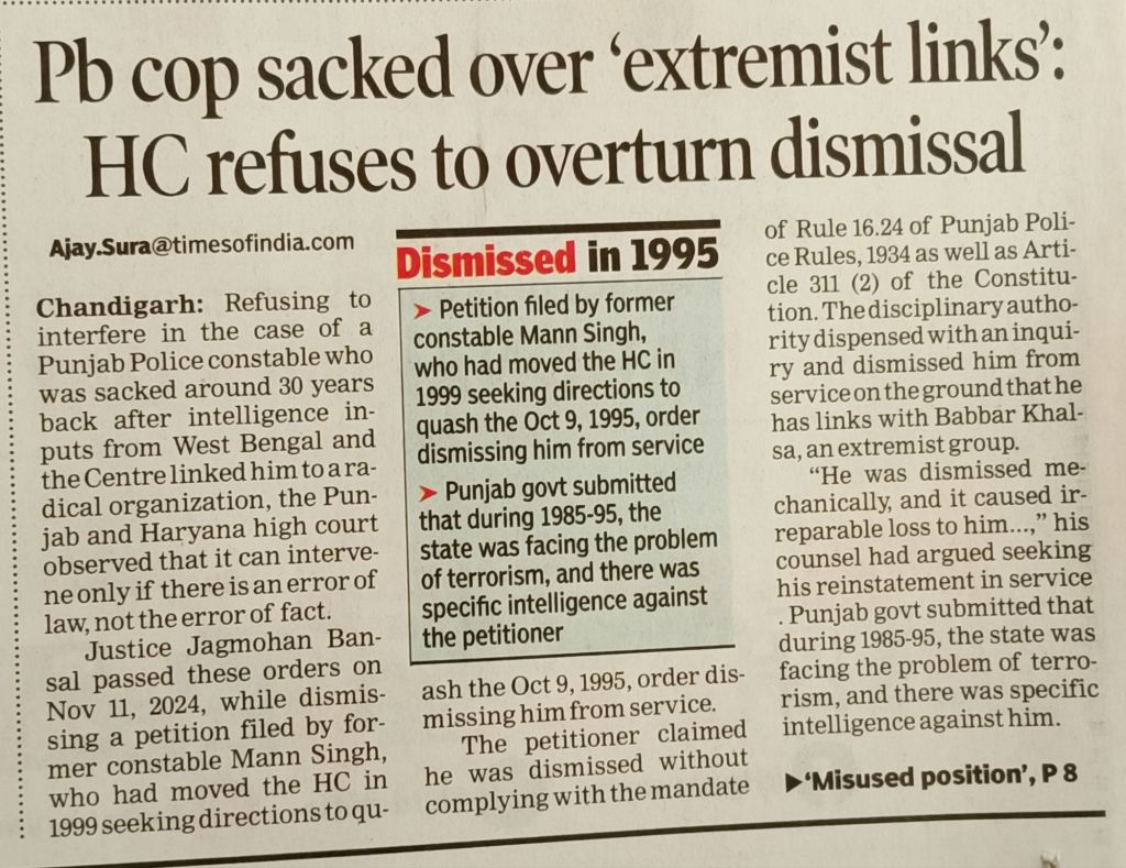 Justice Jagmohan Bansal passed these orders on Nov 11, 2024, while dismidsing a petition filed by former constable Mann Singh, who had moved the HC in 1999 seeking directions to quash the Oct 9, 1995, order dismissing him from service.