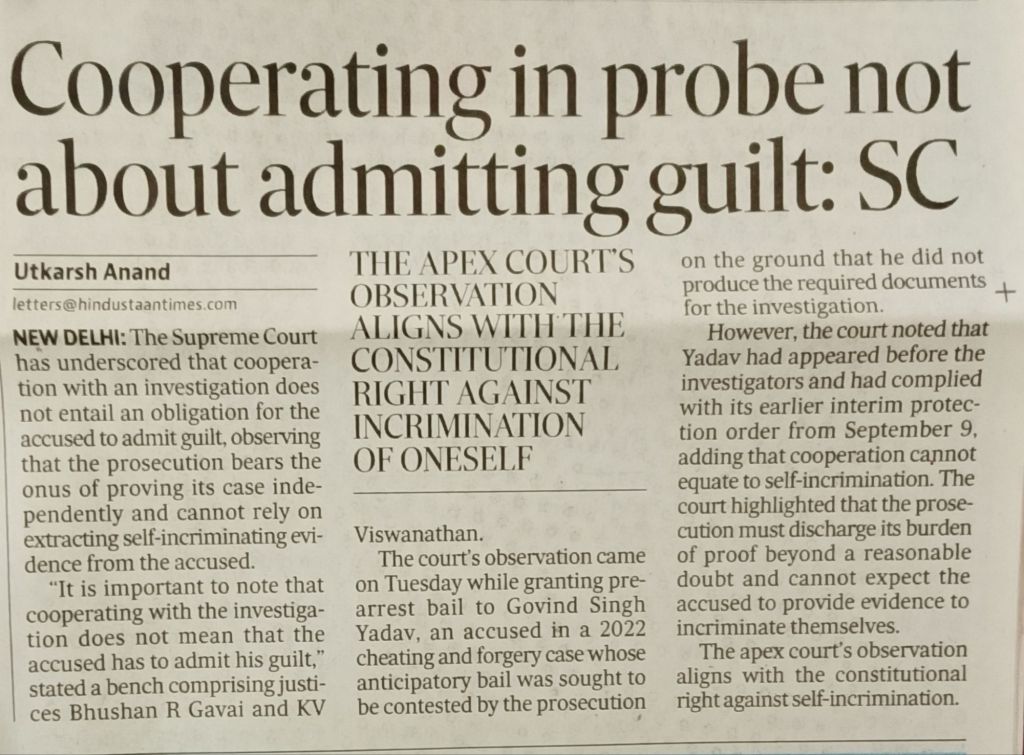 NEW DELHI: The Supreme Court has underscored that coopeгаtion with an investigation does not entail an obligation for the accused to admit guilt, observing that the prosecution bears the onus of proving its case independently and cannot rely on extracting self-incriminating evidence from the accused.
