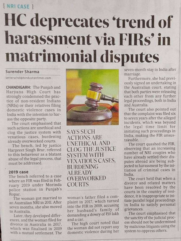 The court quashed the FIR, observing that an increasing number of NRI couples who have already settled their disputes abroad are being subjected to harassment by the initiation of criminal cases in India.
