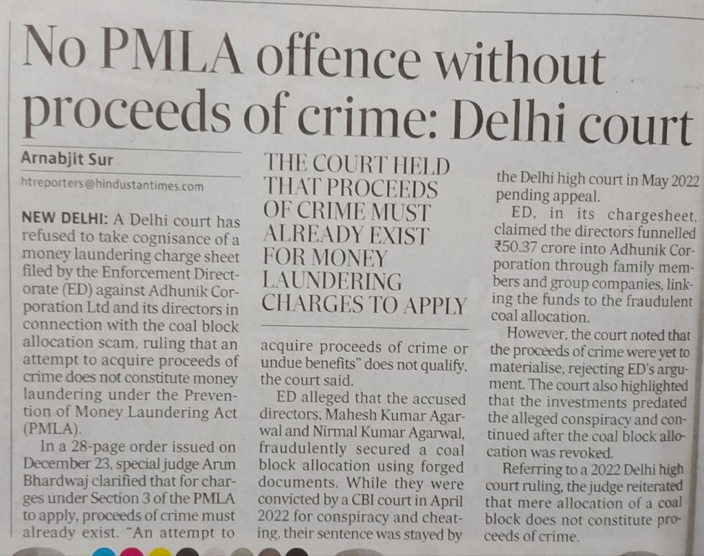 NEW DELHI: A Delhi court has refused to take cognisance of a money laundering charge sheet filed by the Enforcement Directorate (ED) against Adhunik Corporation Ltd and its directors in connection with the coal block allocation scam, ruling that an attempt to acquire proceeds of crime does not constitute money laundering under the Prevention of Money Laundering Act (PMLA).
