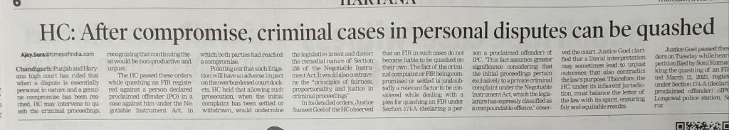 In its detailed orders, Justice Sumeet Goel of the HC observed that an FIR in such cases do not become liable to be quashed on their own. The fact of the criminal complaint or FIR being compromised or settled is undoubtedly a relevant factor to be considered while dealing with a plea for quashing an FIR under Section 174-A (declaring a person a proclaimed offender) of IPC. “This fact assumes greater significance considering that the initial proceedings pertain exclusively to a private criminal complaint under the Negotiable Instrument Act, which the legislature has expressly classified as a compoundable offence,” observed the court. Justice Goel clarified that a literal interpretation may sometimes lead to unjust outcomes that also contradict the law’s purpose. Therefore, the HC, under its inherent jurisdiction, must balance the letter of the law with its spirit, ensuring fair and equitable results.