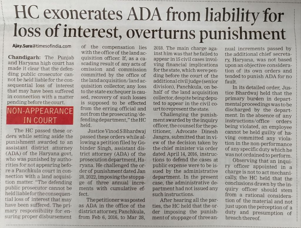 Justice Vinod S Bhardwaj passed these orders while allowing a petition filed by Gobinder Singh, assistant district attorney (ADA) of the prosecution department, Haryana. He challenged the order of punishment dated Jan 28, 2022, imposing the stoppage of three annual increments with cumulative effect.