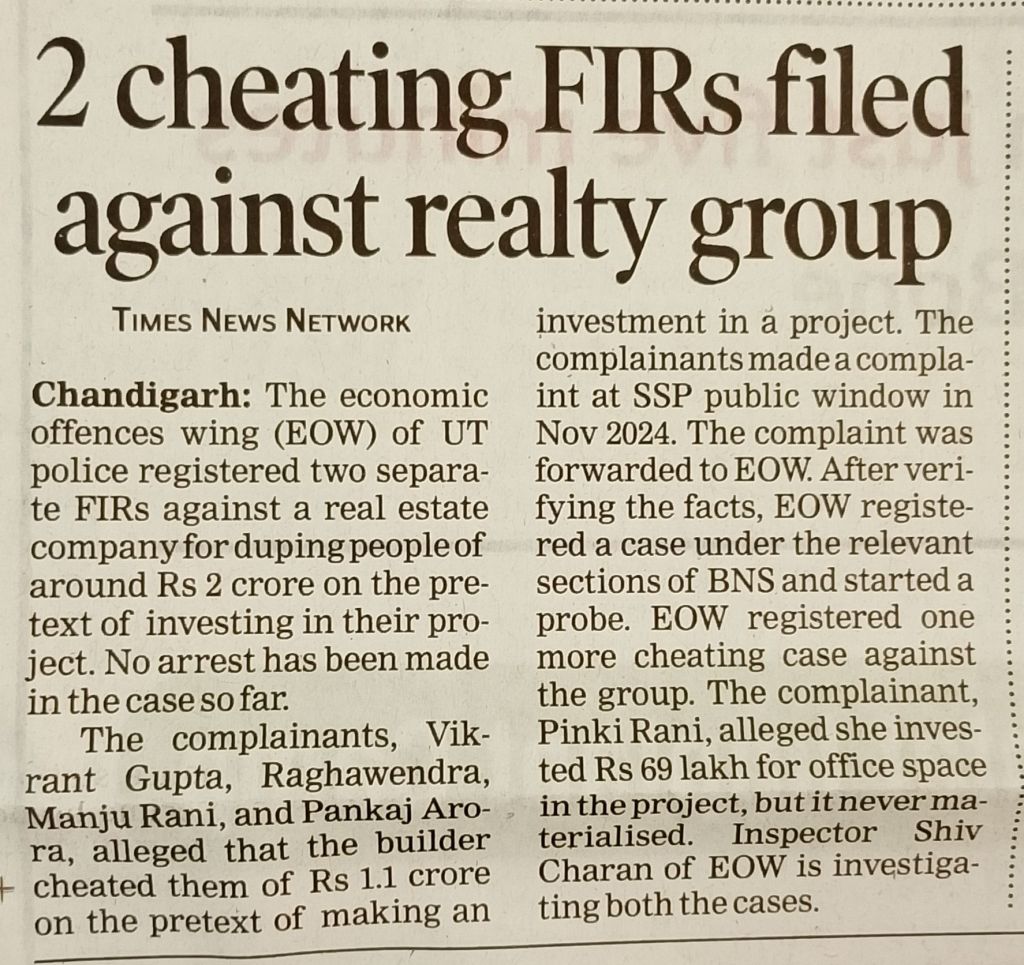 The complainants, Vikrant Gupta, Raghawendra, Manju Rani, and Pankaj Aro-ra, alleged that the builder cheated them of Rs 1.1 crore on the pretext of making an investment in a project. The complainants made a complaint at SSP public window in Nov 2024. The complaint was forwarded to EOW. After verifying the facts, EOW registered a case under the relevant sections of BNS and started a probe. EOW registered one more cheating case against the group. The complainant, Pinki Rani, alleged she invested Rs 69 lakh for office space in the project, but it never materialised. Inspector Shiv Charan of EOW is investigating both the cases.