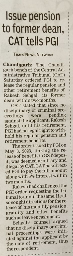 Chandigarh: The Chandigarh bench of the Central Administrative Tribunal (CAT) Saturday ordered PGI to release the regular pension and other retirement benefits of Rakesh Sehgal, its former dean, within two months.