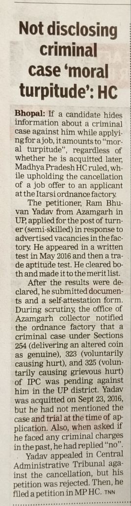 Bhopal: If a candidate hides information about a criminal case against him while applying for a job, it amounts to “moral turpitude”, regardless of whether he is acquitted later, Madhya Pradesh HC ruled, while upholding the cancellation of a job offer to an applicant at the Itarsi ordnance factory.