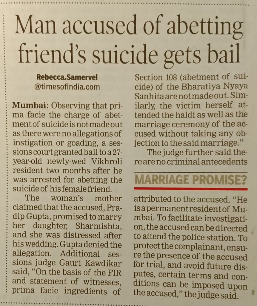 The woman’s mother claimed that the accused, Pradip Gupta, promised to marry her daughter, Sharmishta, and she was distressed after his wedding. Gupta denied the allegation. Additional sessions judge Gauri Kawdikar said, “On the basis of the FIR and statement of witnesses, prima facie ingredients of Section 108 (abetment of sui-cide) of the Bharatiya Nyaya Sanhita are not made out. , the victim herself attended the haldi as well as the marriage ceremony of the accused without taking any objection to the said marriage.”