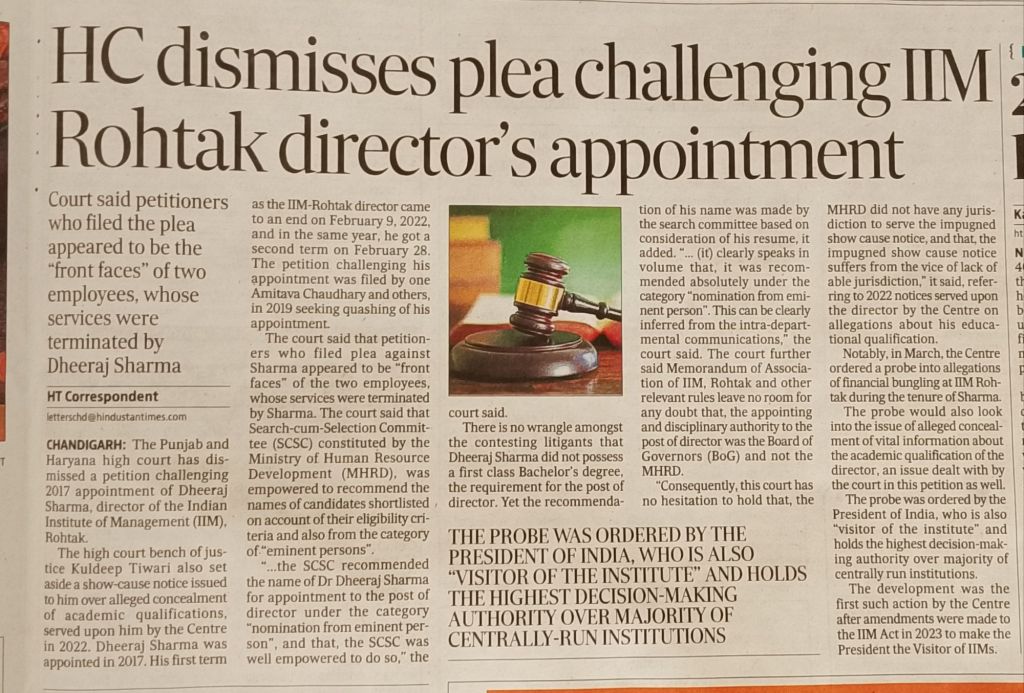 The high court bench of justice Kuldeep Tiwari also set aside a show-cause notice issued to him over alleged concealment of academic qualifications, served upon him by the Centre in 2022. Dheeraj Sharma was appointed in 2017. His first term as the IIM-Rohtak director came to an end on February 9, 2022, and in the same year, he got a second term on February 28. The petition challenging his appointment was filed by one Amitava Chaudhary and others, in 2019 seeking quashing of his appointment.