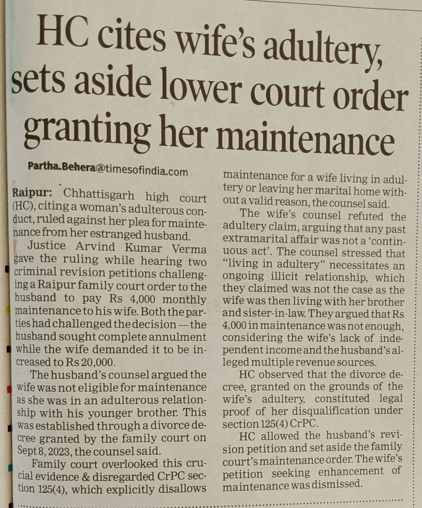 Family court overlooked this crucial evidence & disregarded CrPC section 125(4), which explicitly disallows maintenance for a wife living in adultery or leaving her marital home without a valid reason, the counsel said.