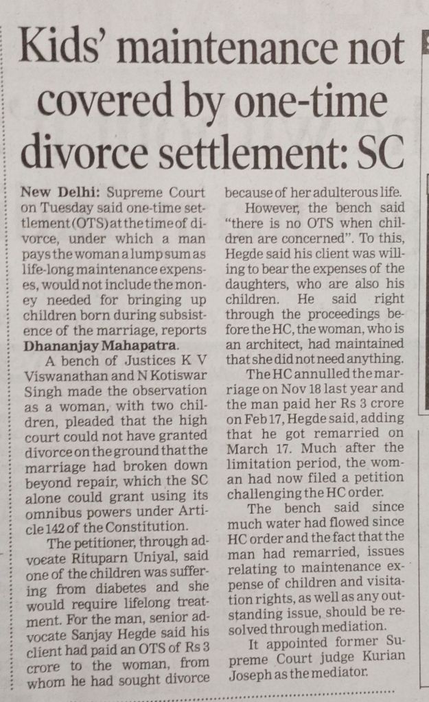 New Delhi: Supreme Court on Tuesday said one-time settlement (OTS) at the time of divorce, under which a man pays the woman a lump sum as life-long maintenance expens es, would not include the money needed for bringing up children born during subsist ence of the marriage, reports Dhananjay Mahapatra.