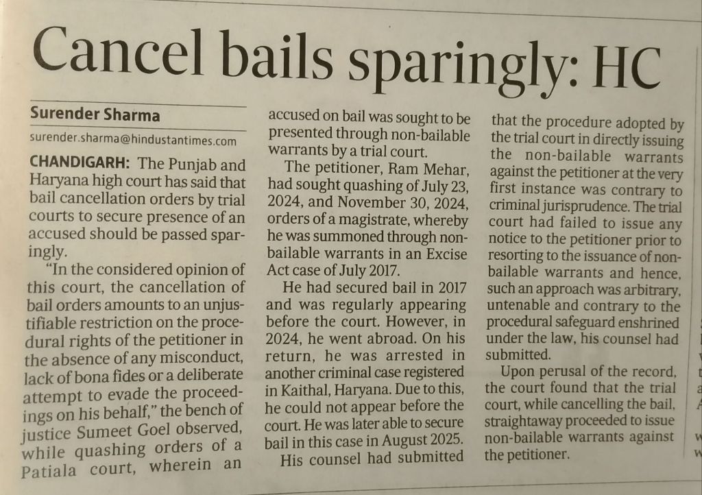 “In the considered opinion of this court, the cancellation of bail orders amounts to an unjustifiable restriction on the proce-dural rights of the petitioner in the absence of any misconduct, lack of bona fides or a deliberate attempt to evade the proceed ings on his behalf,” the bench of justice Sumeet Goel observed, while quashing orders of a Patiala court, wherein an accused on bail was sought to be presented through non-bailable warrants by a trial court.