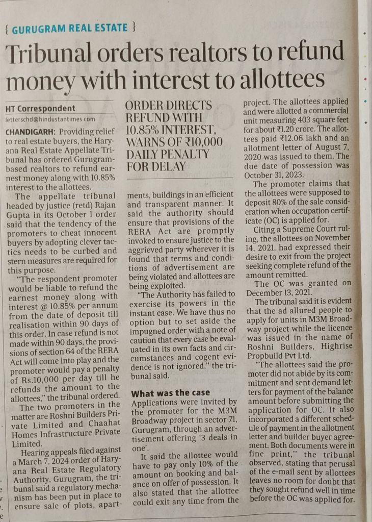 CHANDIGARH: Providing relief to real estate buyers, the Haryana Real Estate Appellate Tribunal has ordered Gurugram-based realtors to refund earnest money along with 10.85% interest to the allottees.