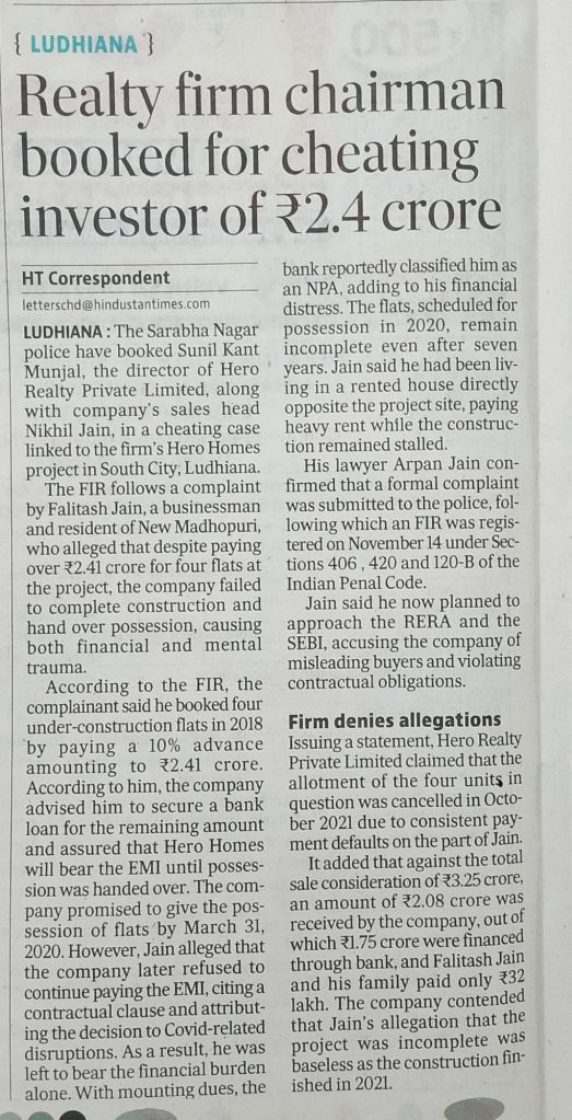 LUDHIANA: The Sarabha Nagar police have booked Sunil Kant Munjal, the director of Hero Realty Private Limited, along with company’s sales head Nikhil Jain, in a cheating case linked to the firm’s Hero Homes project in South City, Ludhiana.