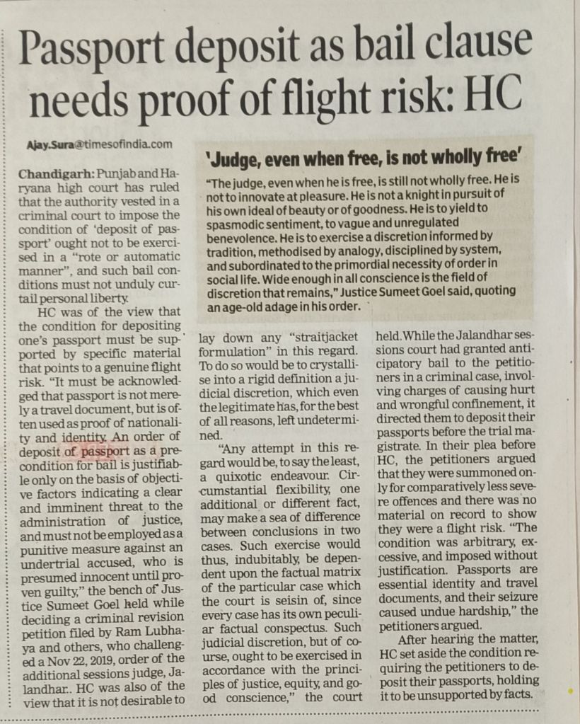 HC was of the view that the condition for depositing one’s passport must be sup ported by specific material that points to a genuine flight risk. “It must be acknowledged that passport is not merely a travel document, but is often used as proof of nationality and identity. An order of deposit of passport as a pre-condition for bail is justifiable only on the basis of objective factors indicating a clear and imminent threat to the administration of justice, and must not be employed as a punitive measure against an undertrial accused, who is presumed innocent until proven guilty,” the bench of Justice Sumeet Goel held while deciding a criminal revision petition filed by Ram Lubhaya and others, who challenged a Nov 22, 2019, order of the additional sessions judge, Jalandhar..