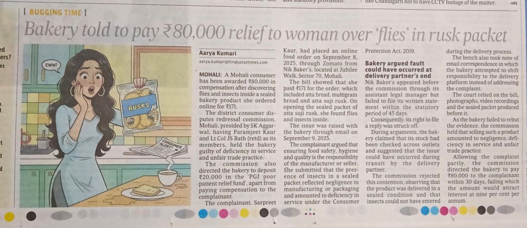 In a significant consumer protection ruling, the District Consumer Disputes Redressal Commission, Mohali has directed a bakery to pay ₹80,000 as compensation to a woman who discovered flies and insects inside a sealed rusk packet ordered online.