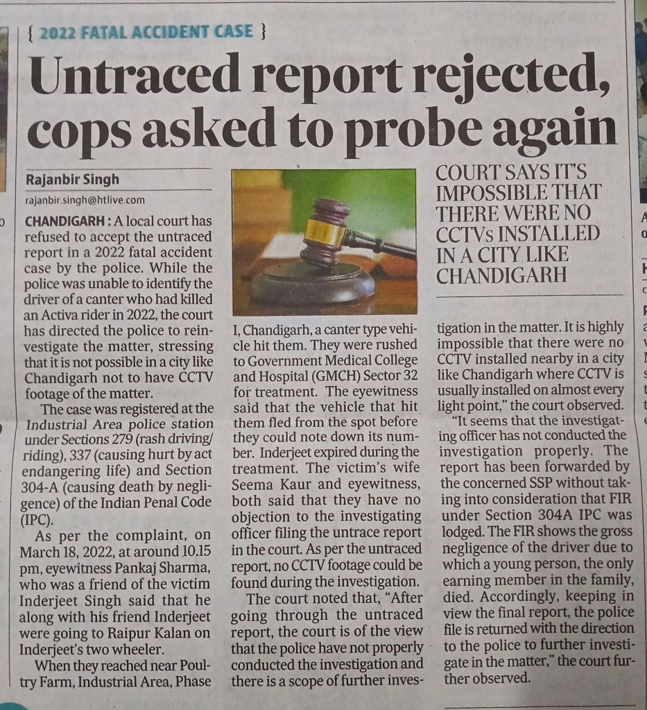 In a significant order, a Chandigarh court has rejected the untraced report filed by the police in a 2022 fatal road accident case and has directed the police to conduct a fresh and proper investigation.