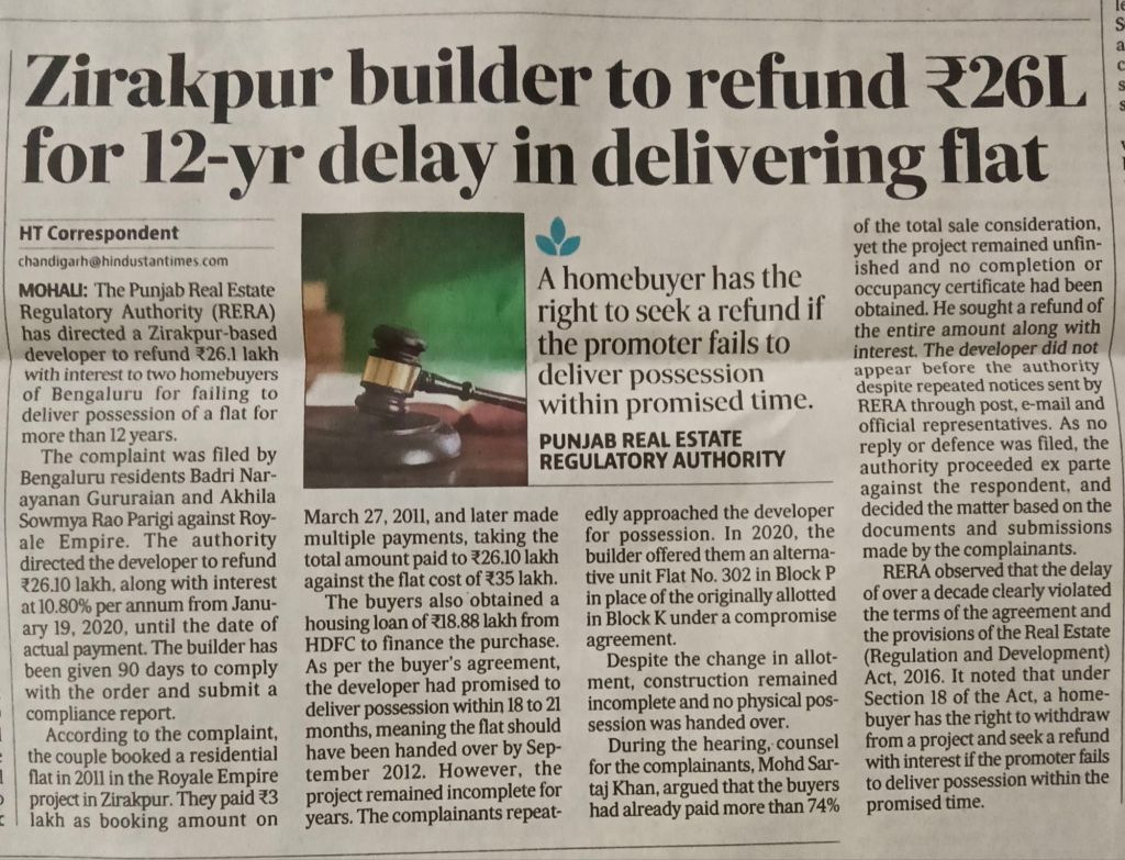 In a significant ruling protecting the rights of homebuyers, the Punjab Real Estate Regulatory Authority has directed a Zirakpur-based builder to refund ₹26.10 lakh along with interest to two buyers after failing to deliver possession of a flat for more than 12 years.