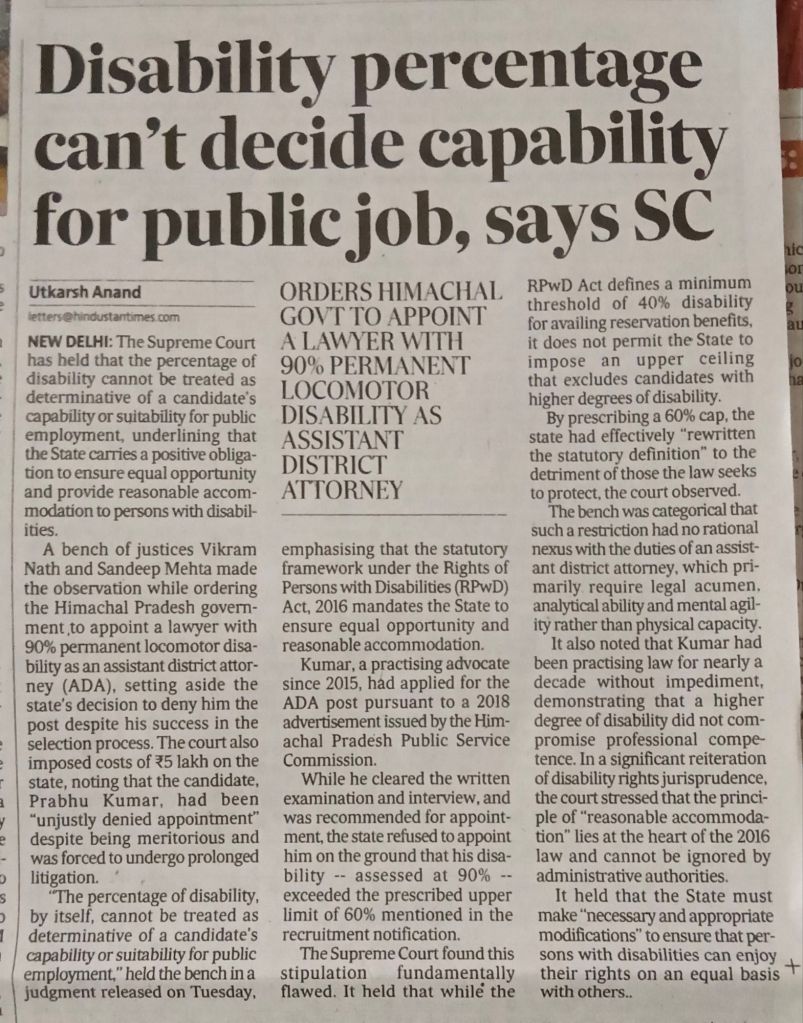 In a landmark ruling, the Supreme Court has clarified that the percentage of disability cannot be the sole criterion to determine a candidate’s capability or suitability for public employment. The judgment reinforces the principles of equality and reasonable accommodation under disability law.