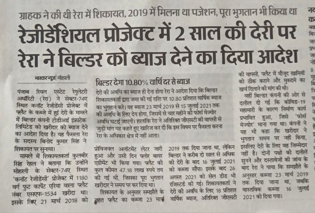 In a significant ruling, the Punjab Real Estate Regulatory Authority (RERA) has directed a builder to pay interest to a homebuyer for a delay of nearly 2 years in handing over possession of a residential property.