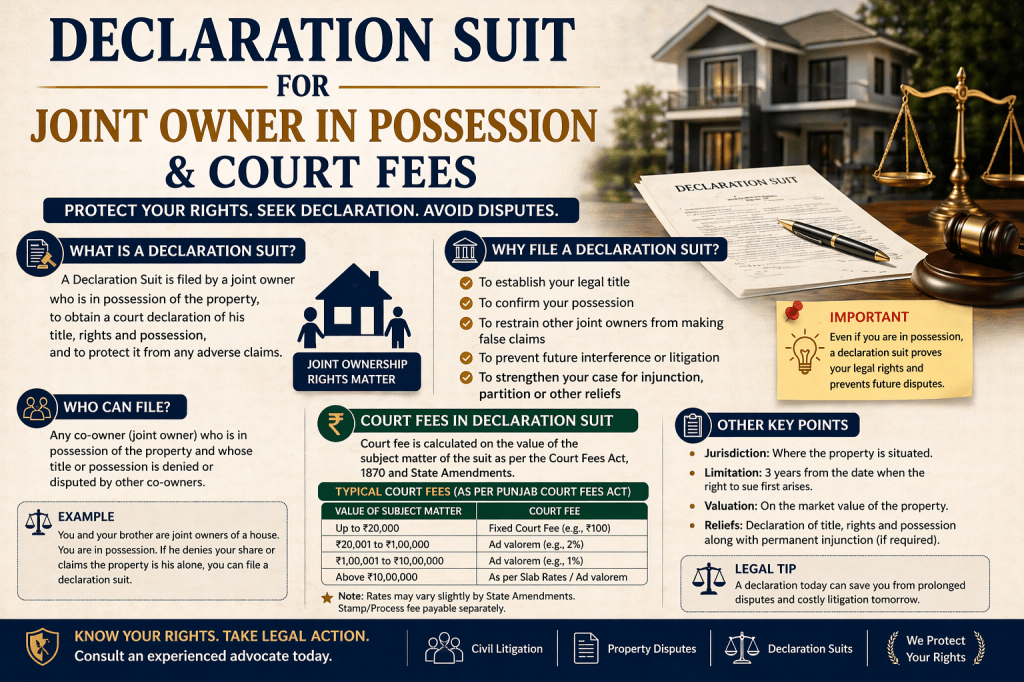 A declaration suit by a joint owner in possession of a property—seeking to establish their share or challenge a document without seeking recovery of possession—does not require high ad valorem (value-based) court fees. Instead, a fixed, minimal fee applies under the Court Fees Act Schedule II Article 17(VA). [1, 2, 3, 4]